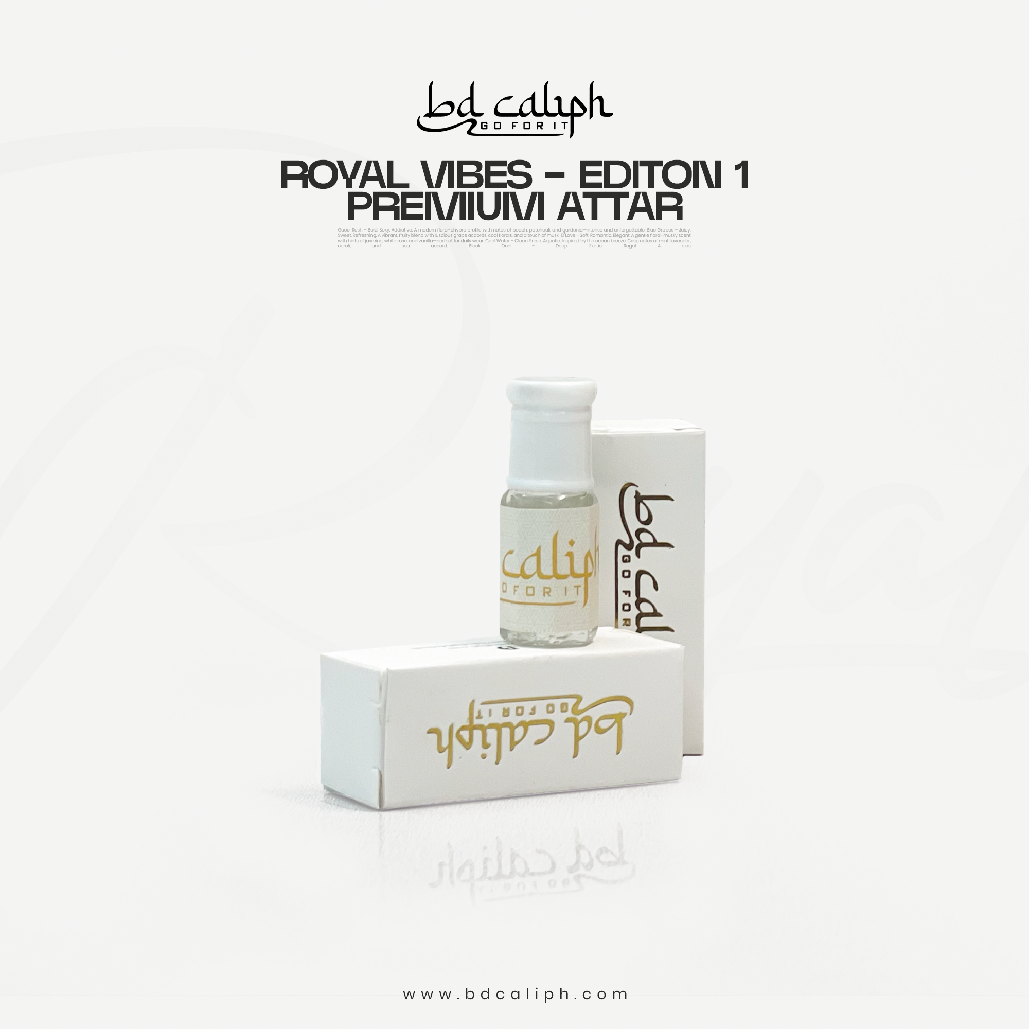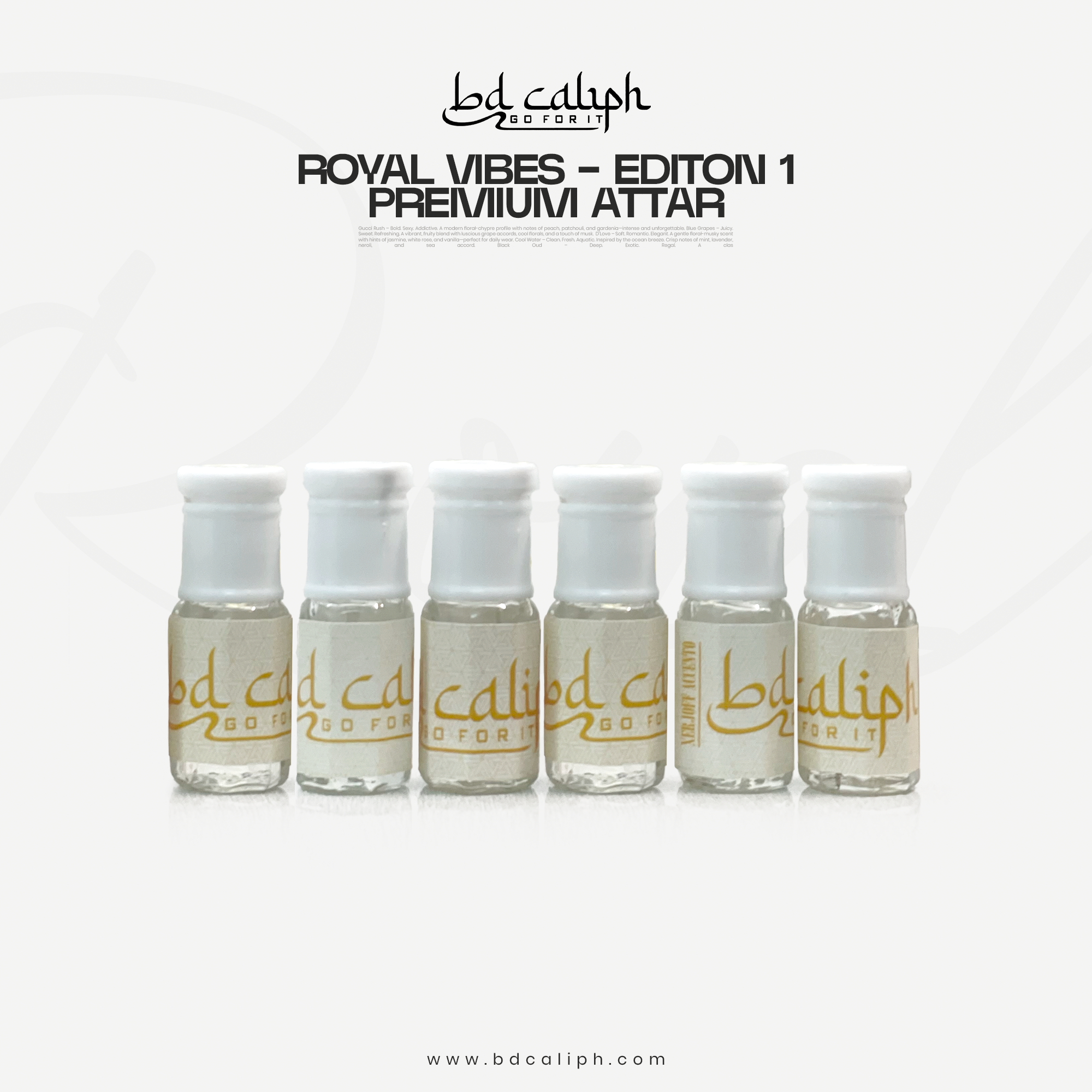 Royal Vibes – Edition 1 brings you six carefully crafted, long-lasting attars inspired by some of the world’s best-selling perfumes: